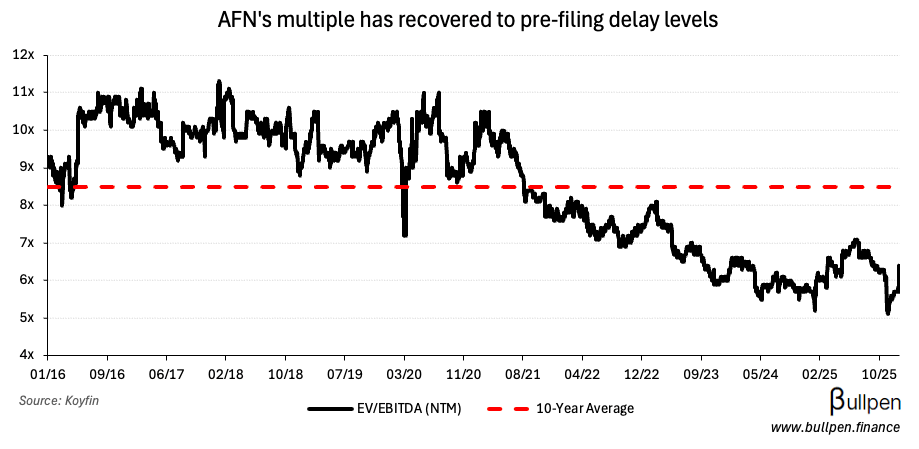 … as the cause for the filing delay turned out to be nothing sinister (weak internal controls). With AFN’s valuation returning to pre-delay levels…