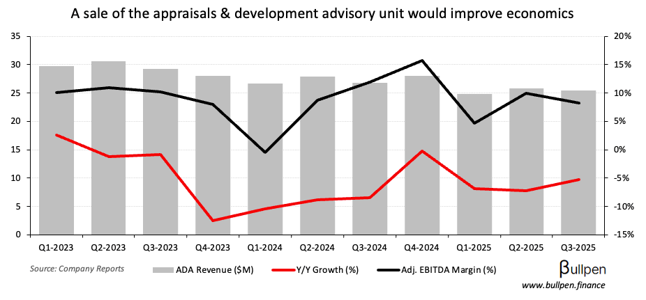 … but should look more achievable after the sale of its appraisals (signed LOI), development advisory, and select analytics businesses - units that weighed on Q3 results and management views as non-core.