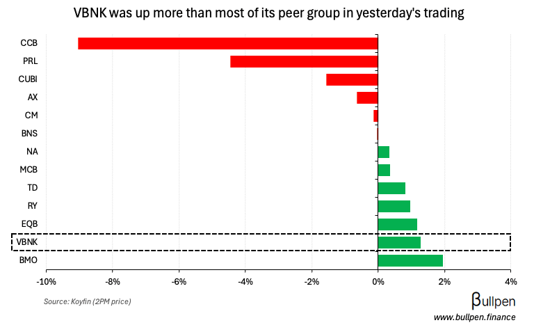 VersaBank (VBNK) was up more than peers yesterday after announcing it will serve as the custodian for Stablecorp’s QCAD, the first regulatory compliant Canadian-dollar stablecoin. With no QCAD in circulation yet, the financial impact isn’t clear…