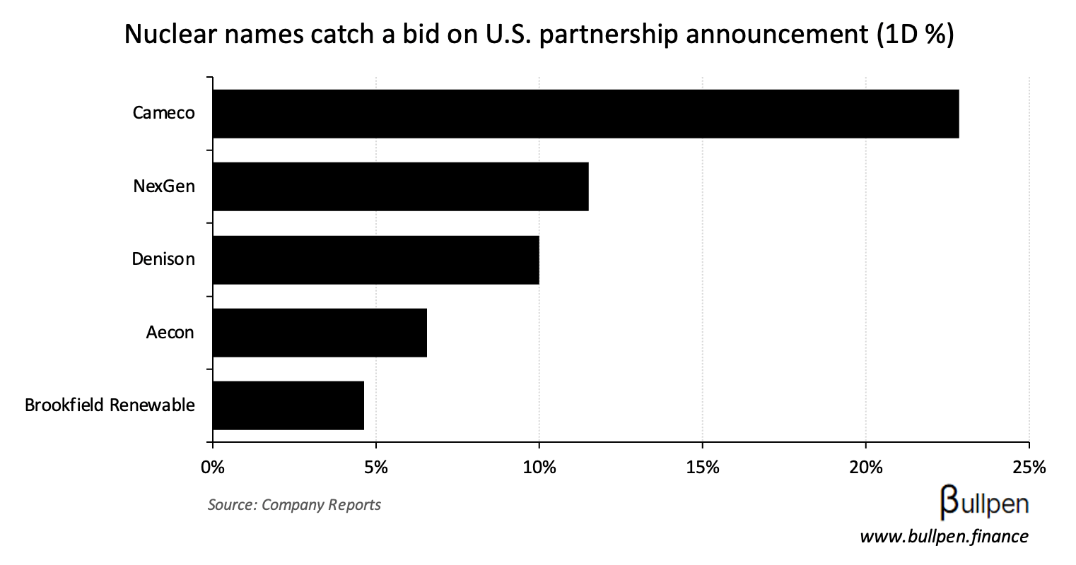 The nuclear theme is on fire, with Brookfield and Cameco announcing a strategic partnership with the U.S. government to accelerate an $80B+ build out of Westinghouse reactors.