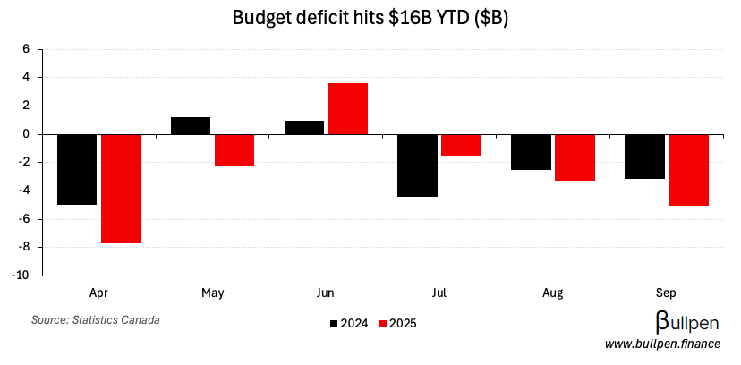 The budgetary deficit was $5B in September, expanding Y/Y on higher program expenses (EI-led) and climbing to $16B on a YTD basis.