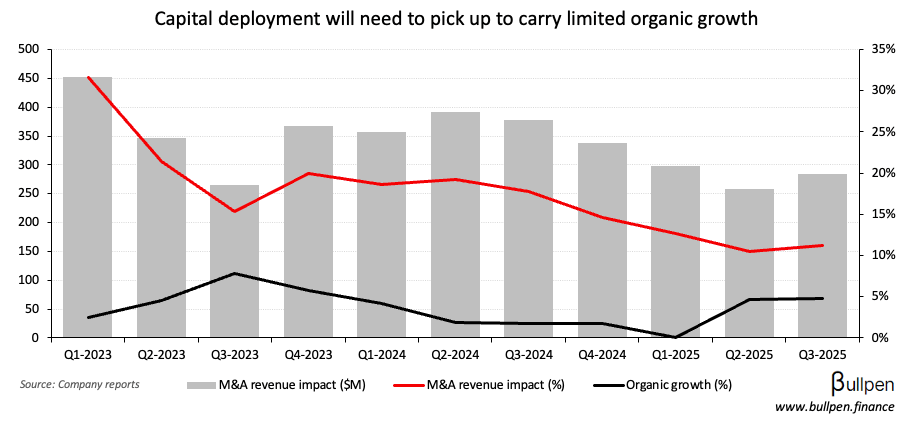 Constellation Software’s (CSU) recent weakness continued after Q3, which beat on earnings but was light on revenue - driven by a slower pace of capital deployment.