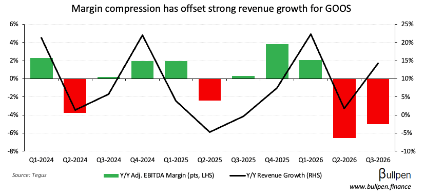 Canada Goose (GOOS) was off nearly 20% after releasing a Q3 that beat on revenue but missed big on profitability, driven by the second straight month of SG&A driven margin compression…