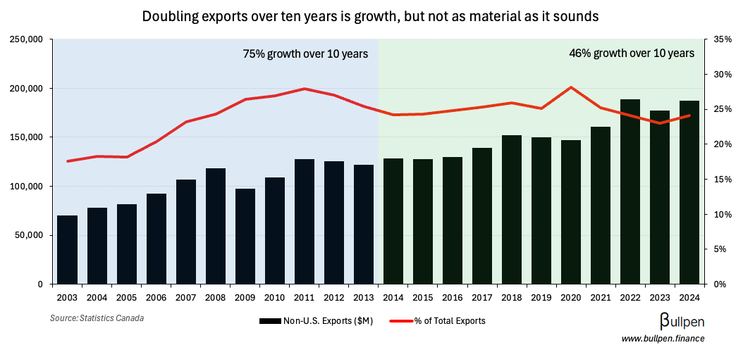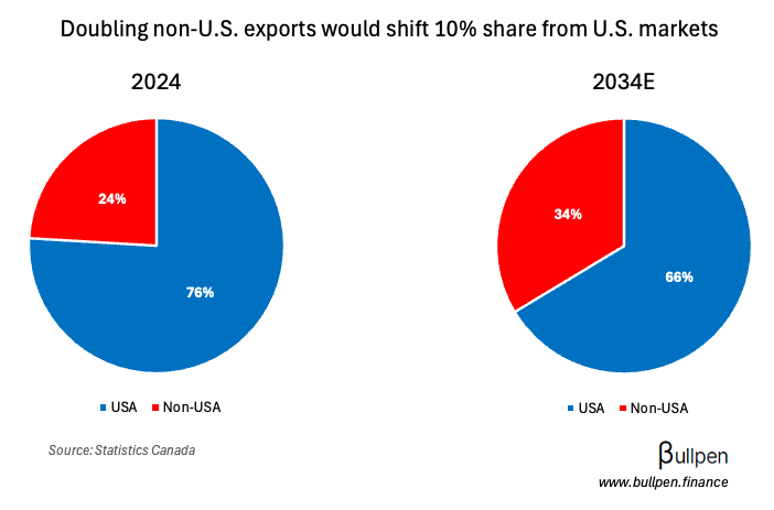 … meaning the impact might be less pronounced than headlines would suggest. Assuming a doubling from 2024 and 25% growth in U.S. exports over that time period (conservative), we’ll have reduced reliance on our neighbours…