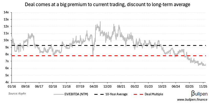 … but over a full turn below its long-term average multiple, driven by six straight quarters of negative organic growth…