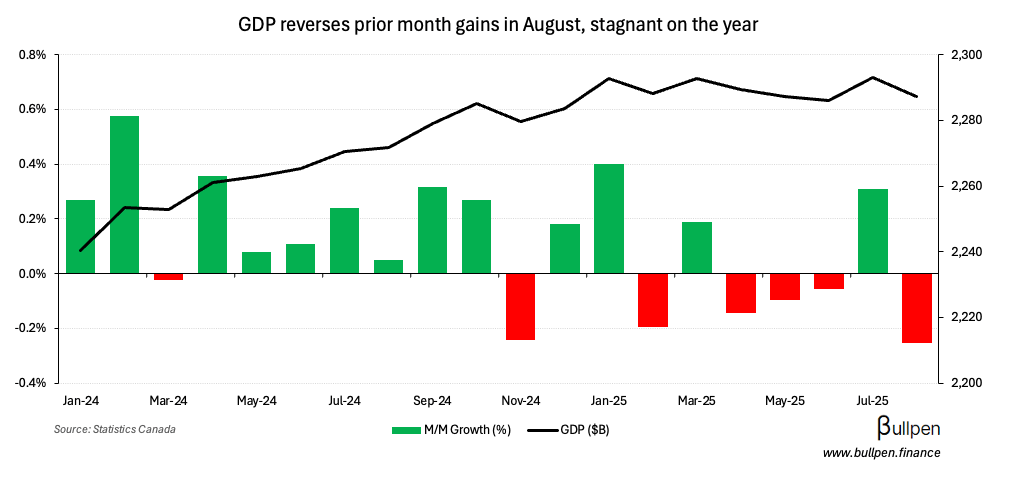 GDP in August missed expectations, falling 0.3% M/M versus estimates for a flat print…