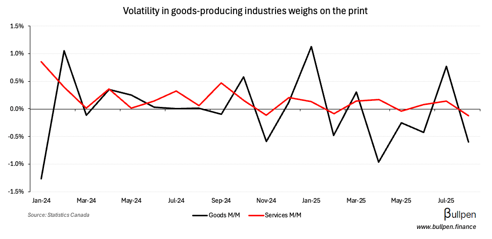… led by goods-producing industries, which shed 0.6% and pulled down a 0.1% drop in services.