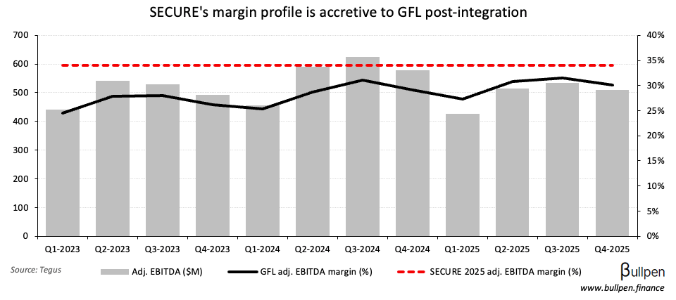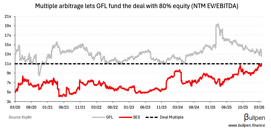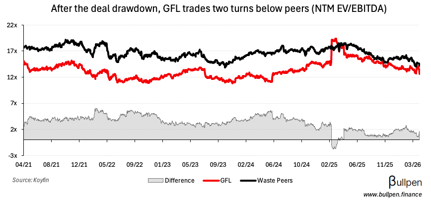 GFL Environmental (GFL) sold off over 10% after announcing the $6.4B acquisition of SECURE Waste (SES), representing roughly 11x forward EBITDA - a ~20% premium to SES shares but a discount to GFL…