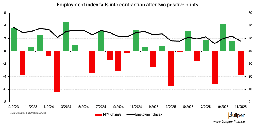 The employment index wasn’t pretty either, declining in November after a couple of strong months - a signal that manufacturing employment could be down in the next jobs print.