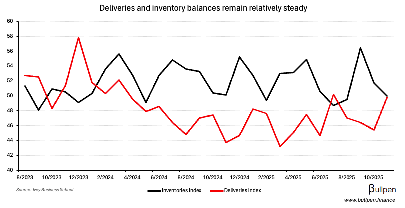 … as inventories try to find the balance, holding steady M/M alongside deliveries.