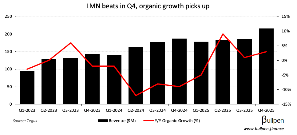 Lumine Group (LMN) ran 21% on its Q4 results, which smoked estimates on 16% Y/Y revenue growth - 13% of which was driven by M&A (3% organic).