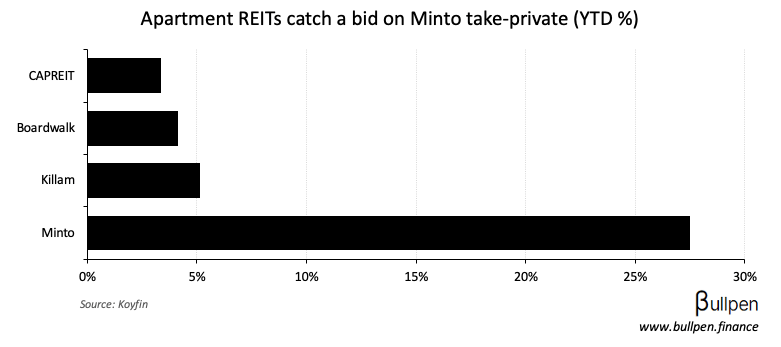 Minto Apartment REIT (MI-U) is the next multi-family REIT to go private in a $2.3B deal led by Crestpoint (CC&L) and Minto Group, leaving three main Canadian players in public markets after InterRent’s take-private last year.