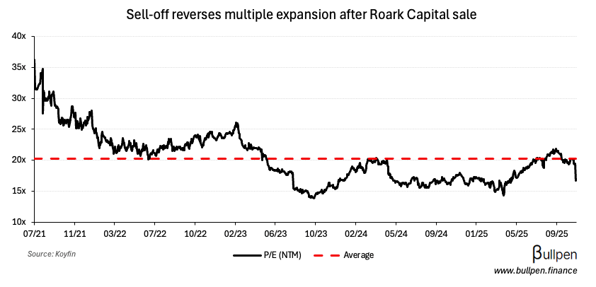 … and keep investors sidelined until they have line of sight to a rebound. With shares giving back gains following Roark Capital’s exit in June, this one could chop sideways for a while.