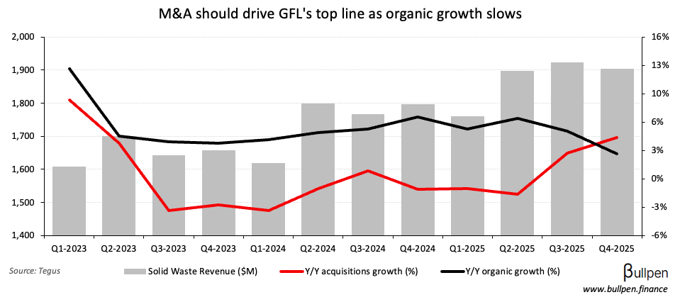 GFL’s acquisition of Frontier Waste is a perfect example, adding a strong regional player (Texas) to its national footprint. The company has added ~$450M of revenue through M&A YTD, offsetting slowing organic growth…