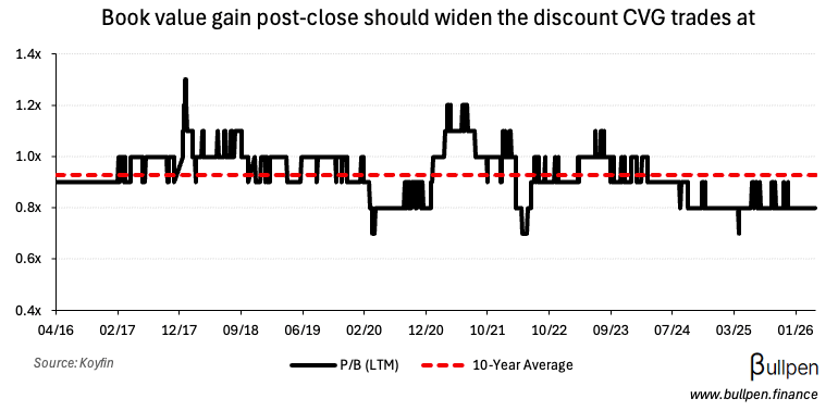 … resulting in a $2 per share book value gain post-close, further widening the discount CVG trades at.