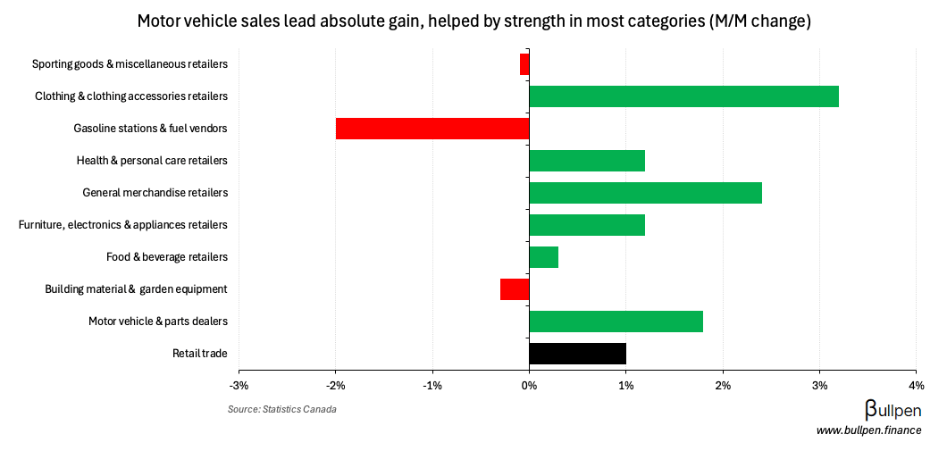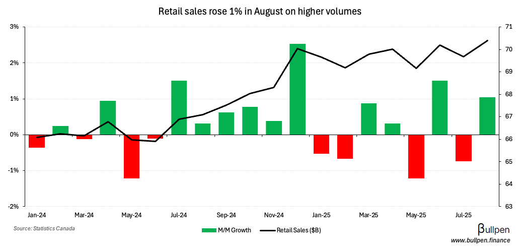 August’s retail sales shaped up largely as expected, gaining 1% M/M on an identical increase in volumes. Results were helped by a 1.8% gain in vehicle sales…