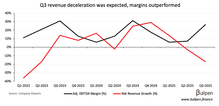Spin Master (TOY) jumped 10% on its Q3 results, which were light on revenue but strong on margins - as the company adjusted to supply chain shocks from earlier in the year.