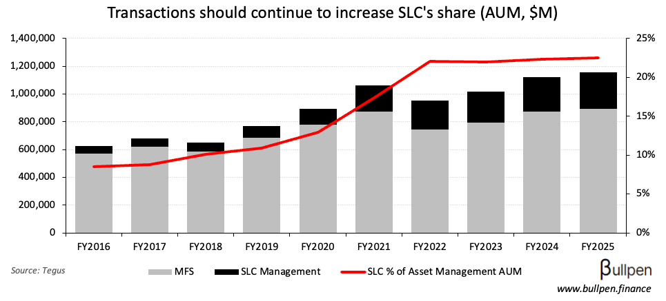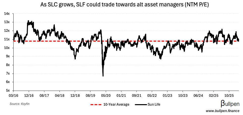 As SLC scales, the market should assign more weight to the alternatives business - which trades at a higher multiple than traditional L&H insurance.