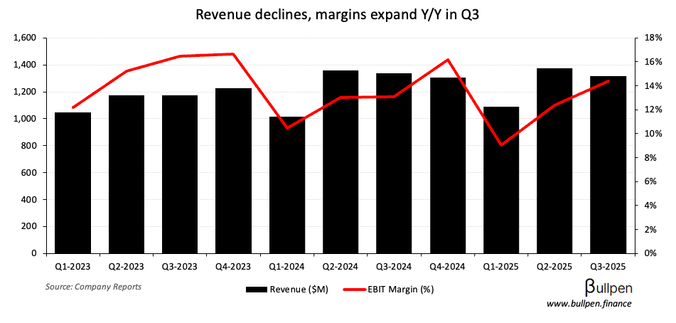 Toromont (TIH) gained 7% on its Q3, which missed on revenue and beat on earnings thanks to strong Y/Y margin expansion.