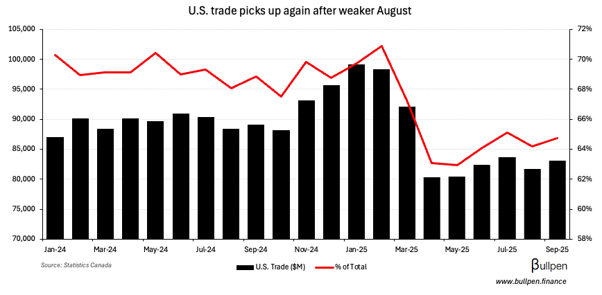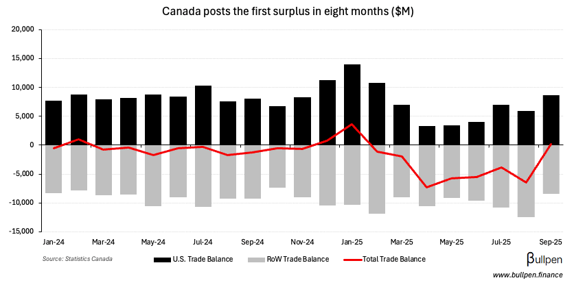 September’s ~$150M trade surplus was the first in eight months, tracking ahead of expectations for a $4.5B deficit and improving versus August’s $6.4B…