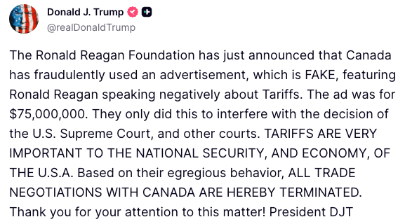 Speaking of pain, Trump has “put a stop” to all trade negotiations with Canada - citing an anti-tariff ad ran by Ontario…