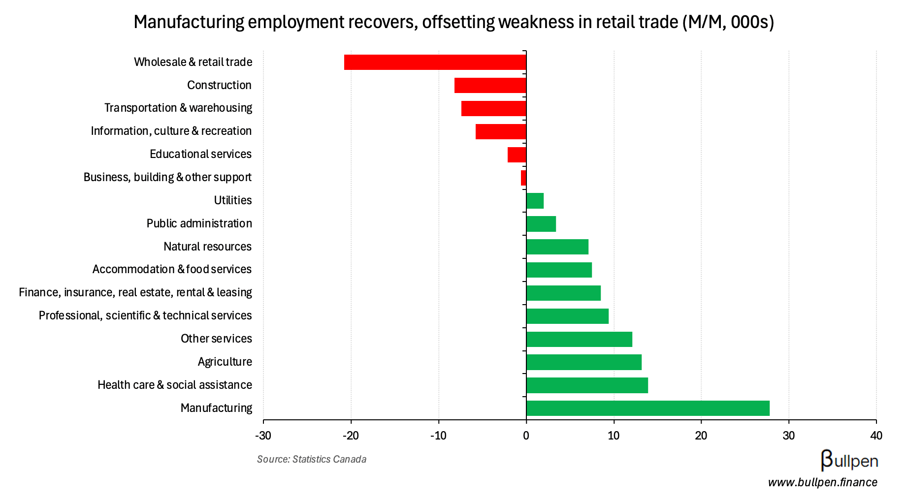 Results were mixed at the industry level, with weakness in retail trade carried by strength in manufacturing - a result we highlighted as likely in the Ivey PMI print…